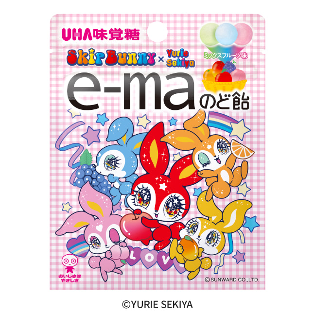 5匹のカラフルなウサギのキャラクターとポップな世界観がe-maのど飴との親和性が高いです。
