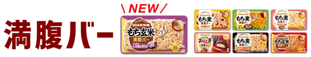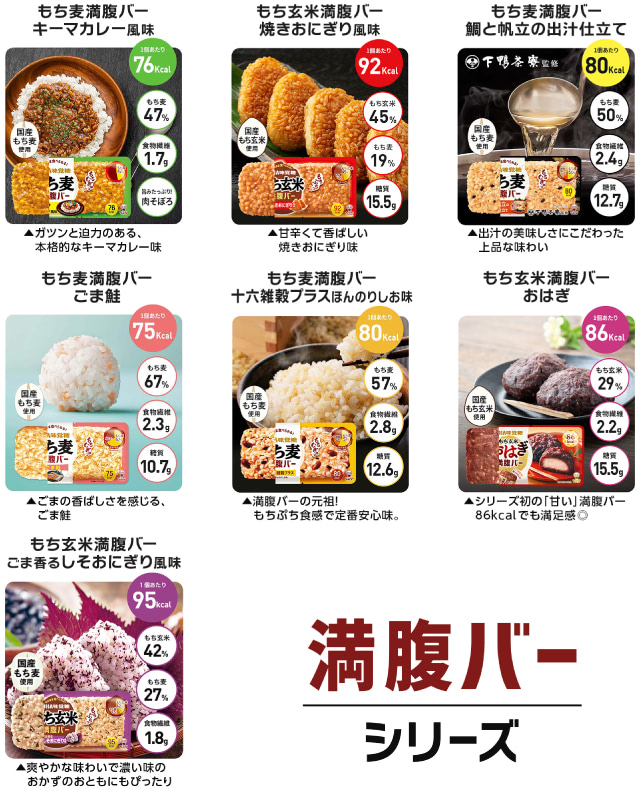 「満腹バー」は白米不使用、食物繊維が豊富でヘルシーなもち麦やもち玄米等をバー状に固め、罪悪感なく小腹を満たすことができる商品です。