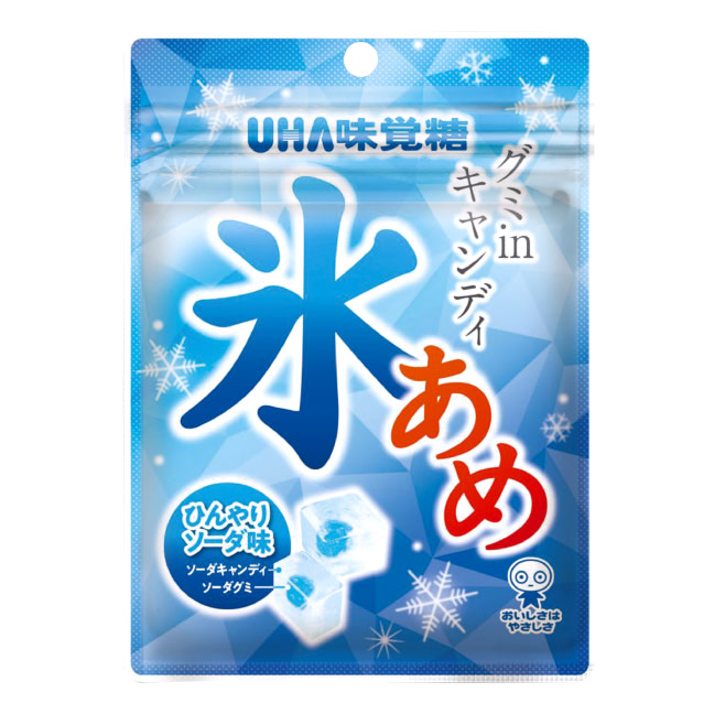 センター部分に氷の冷涼を想起させるソーダ味のグミが入っております。キャンディとグミの2つの食感を楽しんでいただけます。