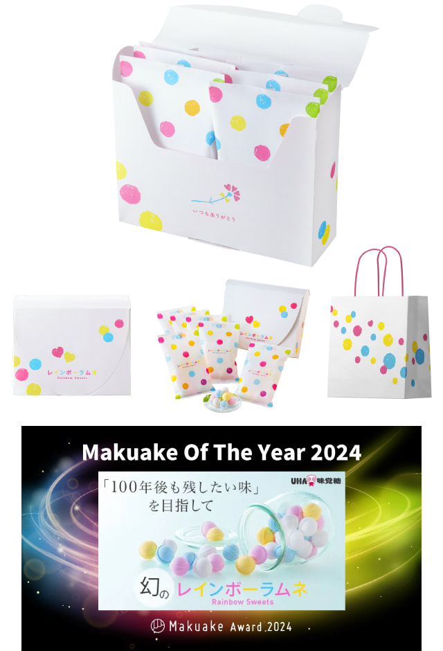 そんな中、UHA味覚糖の代表 山田がお声掛けをして平口治氏と思いを共有させていただき、「全国のファンにレインボーラムネを届けること」「この味と技術を後世に引き継いでいくこと」をミッションとして製造技術を継承させていただくこととなりました。そして、「100年後も残したい味」プロジェクトと銘打って、製品化へ向けた取り組みを開始。取り組みは大手クラウドファンディングサービス「Makuake」に掲載され、掲載プロジェクト6,699件の中から、サポーターからの支持や応援購入総額を集め話題になったプロジェクト、社会的にインパクトの大きかったプロジェクト25件が選定される「Makuake Of The Year 2024」を受賞しました。