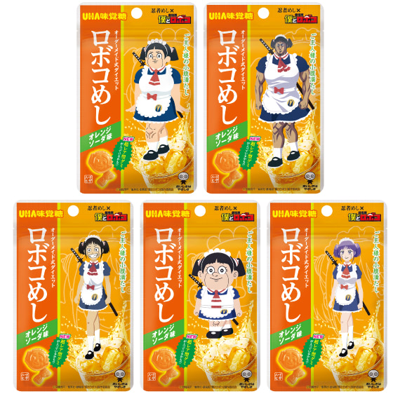 味は作中に頻繁に登場するロボコたちの愛用ドリンクをイメージした「オレンジソーダ味」に仕上げました。パッケージは、主人公であるロボコを忍者めしのシュールな世界観で表現しました。通常のロボコだけでなく、マルチバースのロボコが登場し、忍者めしだけのオリジナルロボコが全5種類!全部集めたくなるここでしか手に入らない特別なデザインに仕上げました。