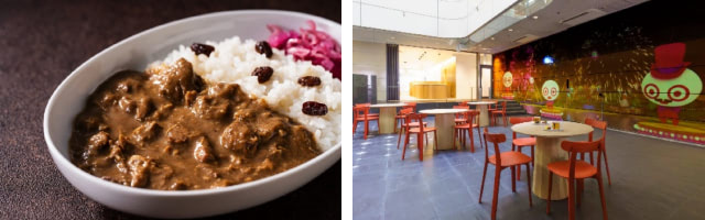 (写真左)新メニュー「オートファジーカレー」。様々なオートファジー食材が溶け込み、深みのあるコクとうま味の本格的な味わいで、誰もが楽しめる程よくスパイシーな逸品。 (写真右)UHA味覚糖本社2階カフェ「UHA PARK&CAFÉ」にて提供。