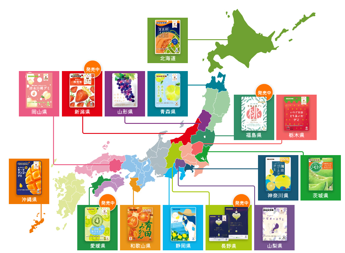 全国のおいしいものをピックアップ!果物のおいしさをグミやキャンディにのせてお届けします。